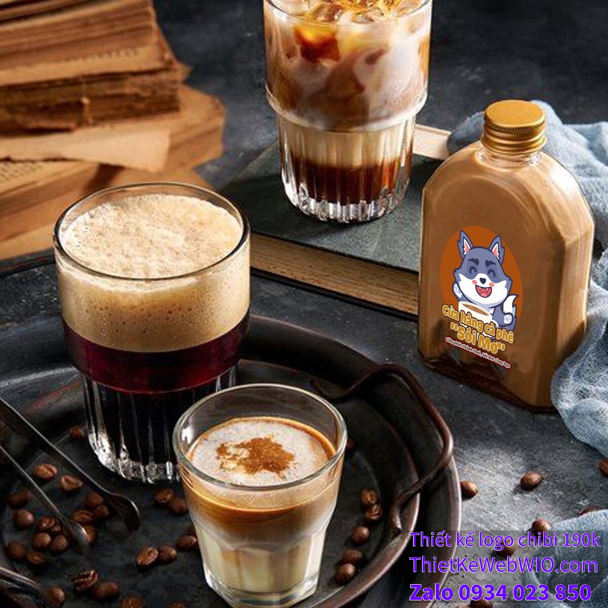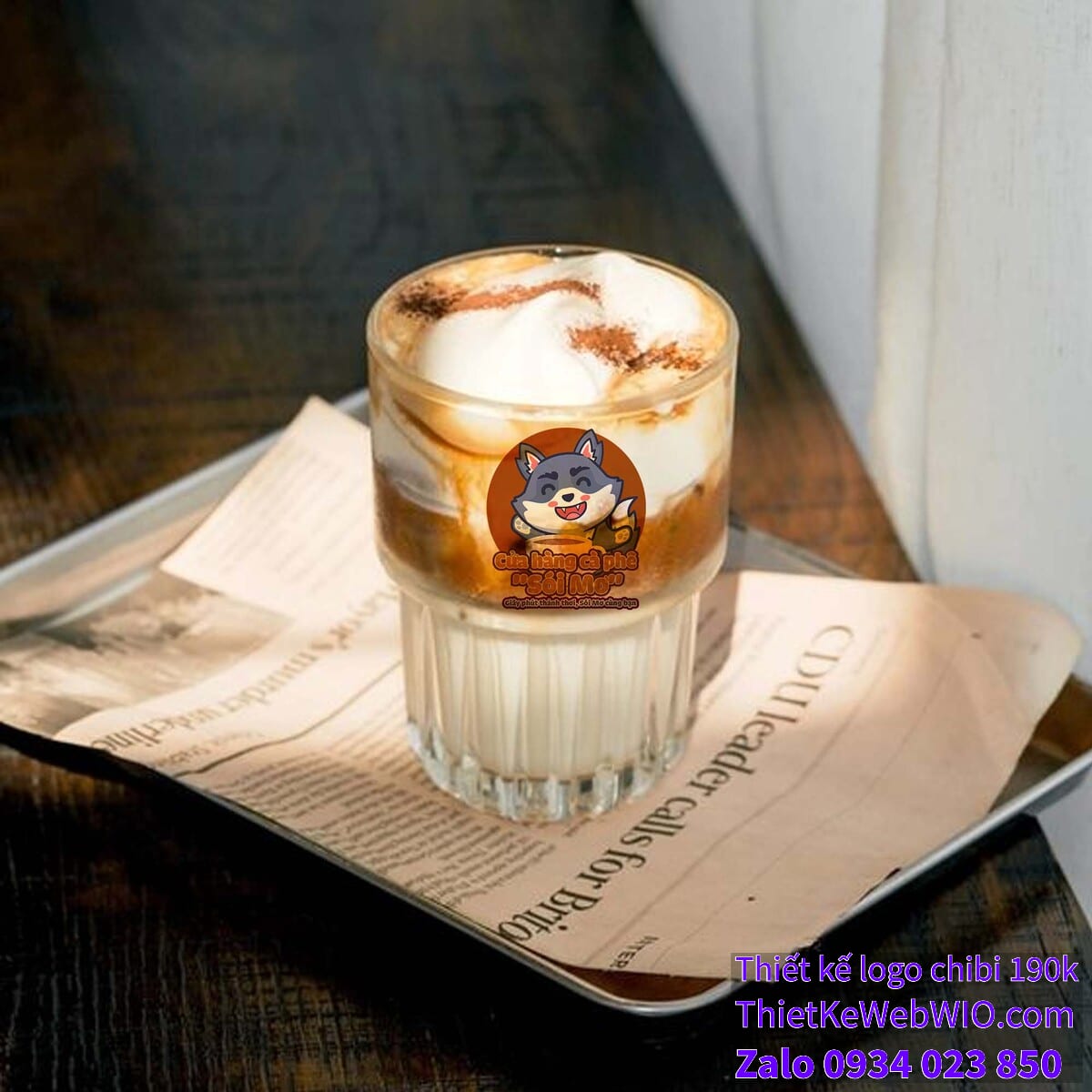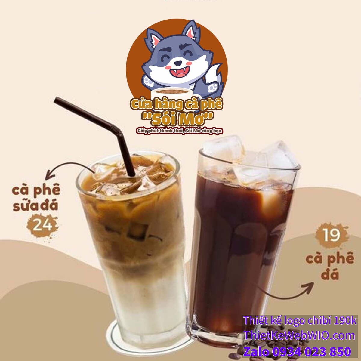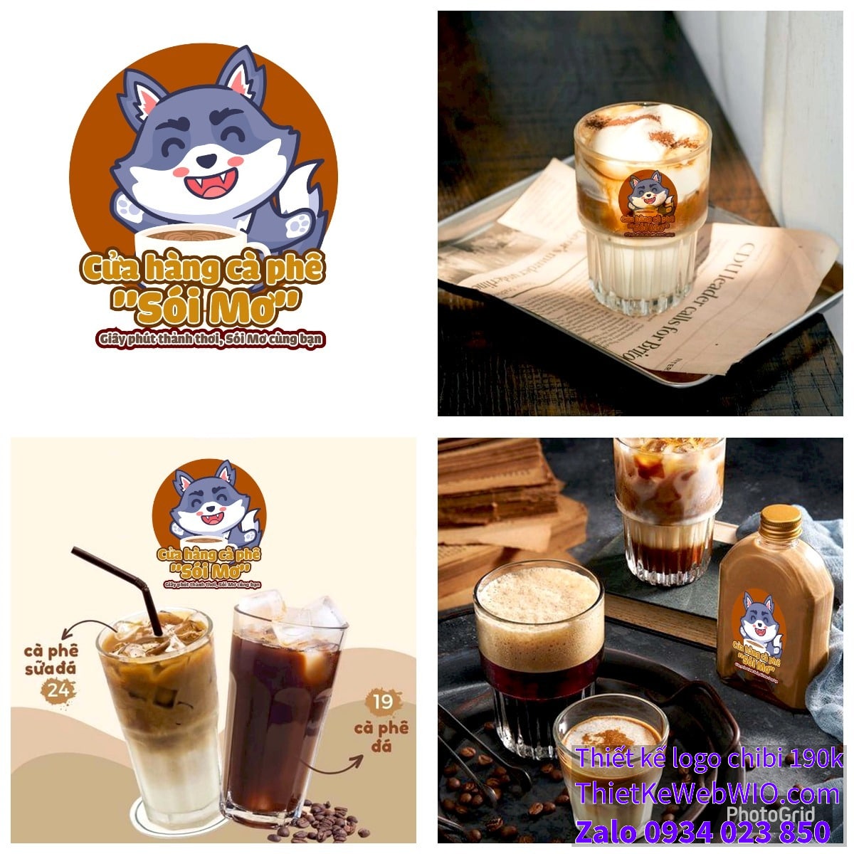 - Chữ viết: Bên dưới hình ảnh chibi sói xám đang cười vui vẻ bên ly cà phê là tên cửa hàng “Cửa hàng cà phê ‘Sói Mơ'” với font chữ dày, dễ đọc và màu sắc hài hòa với tổng thể. Dòng slogan “Giây phút thảnh thơi, Sói Mơ cùng bạn” được viết nhỏ hơn, nhưng vẫn rõ ràng và thể hiện thông điệp của quán cà phê.